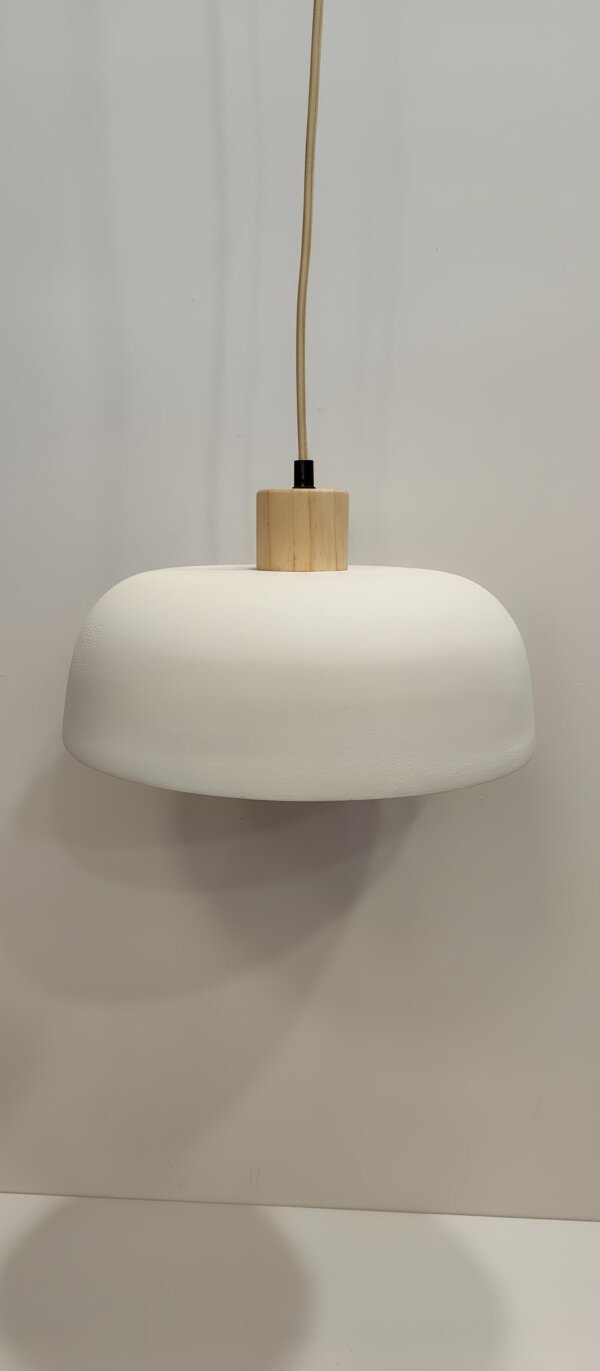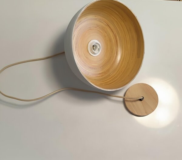 A estrutura em bambu confere leveza visual e resistência, enquanto o acabamento em tom off white adiciona elegância e versatilidade estética. O conjunto elétrico inclui soquete padrão E27 e cabo com interruptor, permitindo instalação simples e uso imediato.