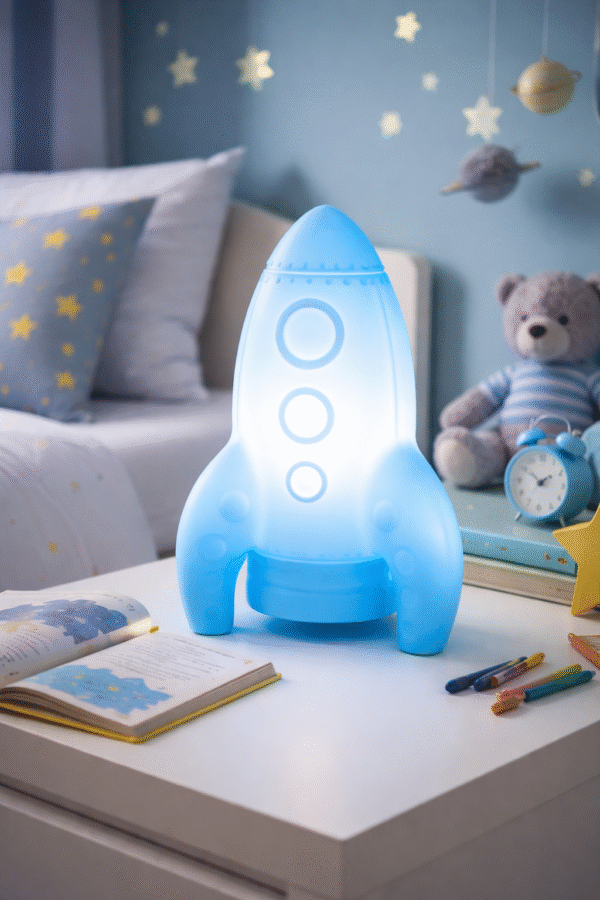 A Luminária Foguete Azul é perfeita para transformar a iluminação em parte da decoração. Com design inspirado em um foguete espacial, ela adiciona criatividade, cor e personalidade ao ambiente, criando uma atmosfera divertida e acolhedora para crianças e projetos modernos.