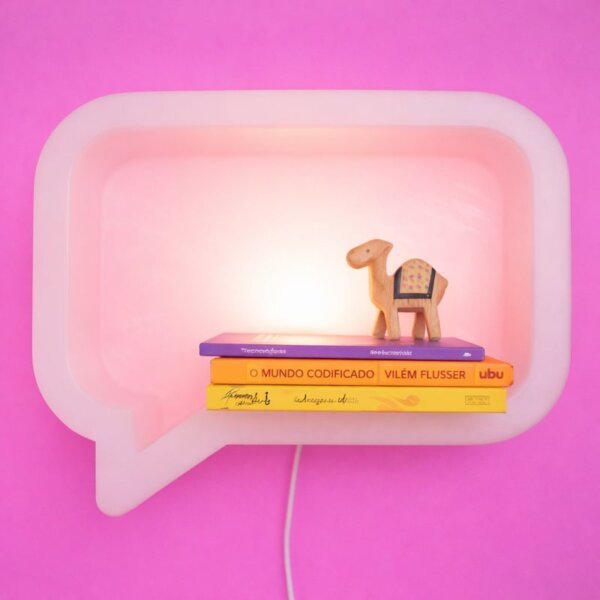 Além de iluminar de forma suave e aconchegante, o nicho funciona como espaço funcional para expor pequenos objetos, brinquedos, livros, colecionáveis e itens decorativos, valorizando a composição visual do ambiente. O formato de balão de fala remete à comunicação, criatividade e expressão, tornando o espaço mais interativo e personalizado.